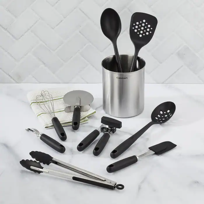 Cuisinart® presenta el set ideal para todo cocinero casero: una completa colección de utensilios esenciales organizada en un elegante recipiente de acero inoxidable, perfecto para tener siempre a mano sobre la encimera. Incluye todas las herramientas básicas necesarias para preparar tus recetas favoritas con comodidad y estilo.