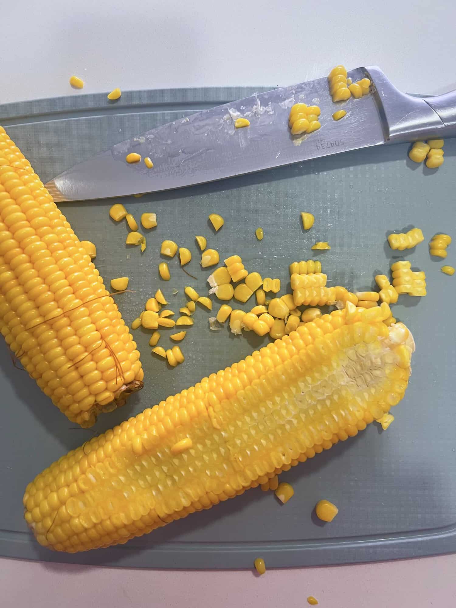 Retira las mazorcas del agua y deja enfriar 5 minutos. Apoya cada mazorca en posición vertical sobre una tabla y, con un cuchillo, corta los granos de arriba hacia abajo girando la mazorca hasta desgranarla por completo