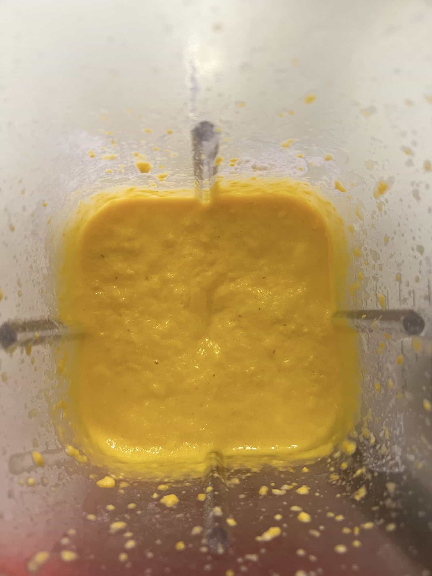 En la licuadora, agrega los granos de choclo, 2 cucharadas mantequilla clarificada, 2 huevos, 2 cucharadas miel de abeja pura, 1/2 taza de harina de arroz y 4 cucharadas leche vegetal. Licúa hasta obtener una mezcla suave y homogénea. Si queda muy espesa, agrega un chorrito más de leche vegetal.