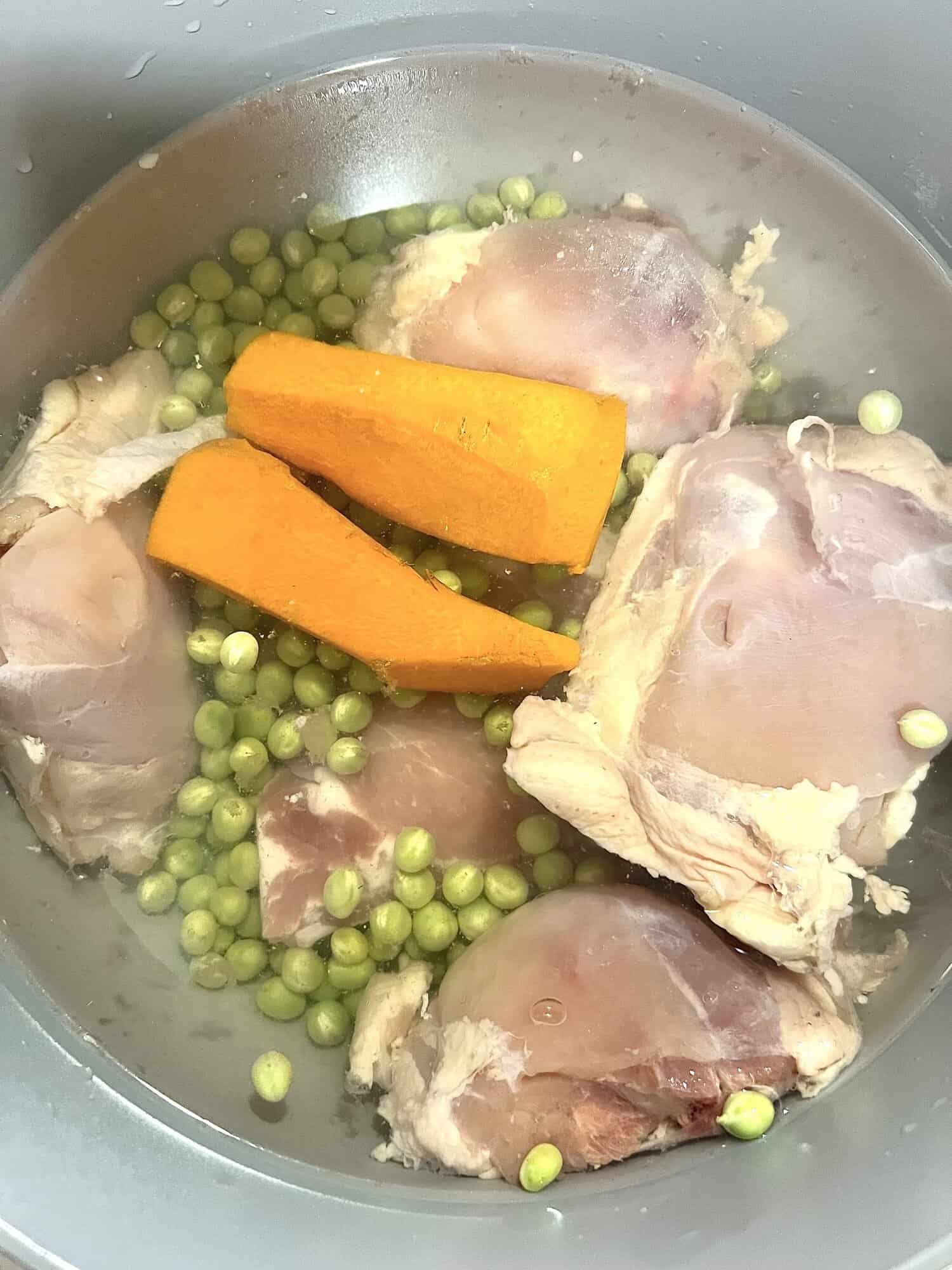 En una olla grande, hierve los contramuslos sin piel junto con el cerdo en agua a fuego medio-alto. Agrega las arvejas y las zanahorias peladas y cocina por unos 30 minutos o hasta que el pollo esté completamente tierno. Yo siempre uso contramuslos porque le dan más sabor, pero puedes usar la presa que tengas en casa.