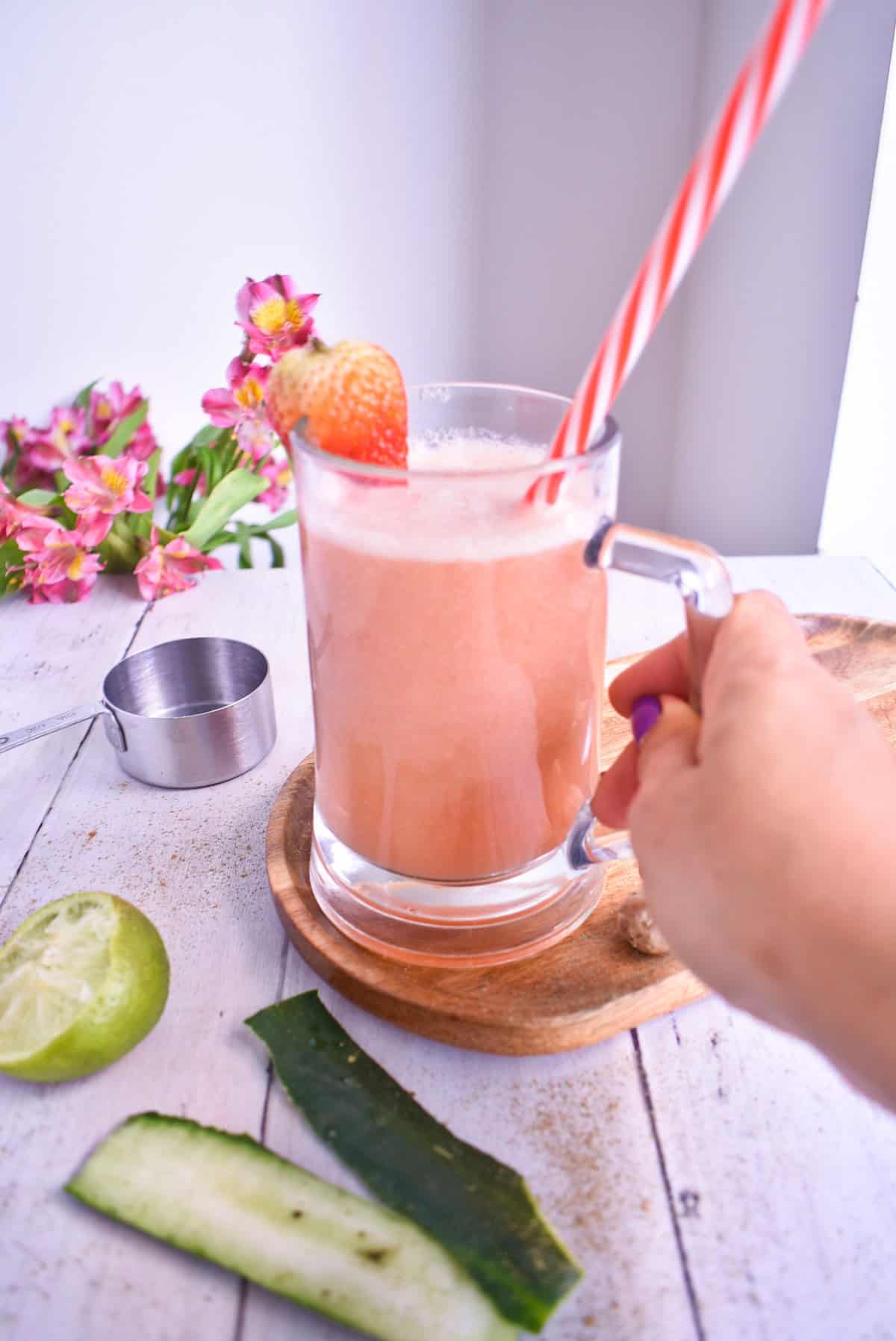 Coloca en la licuadora las fresas, el pepino, la albahaca, el jengibre y el agua