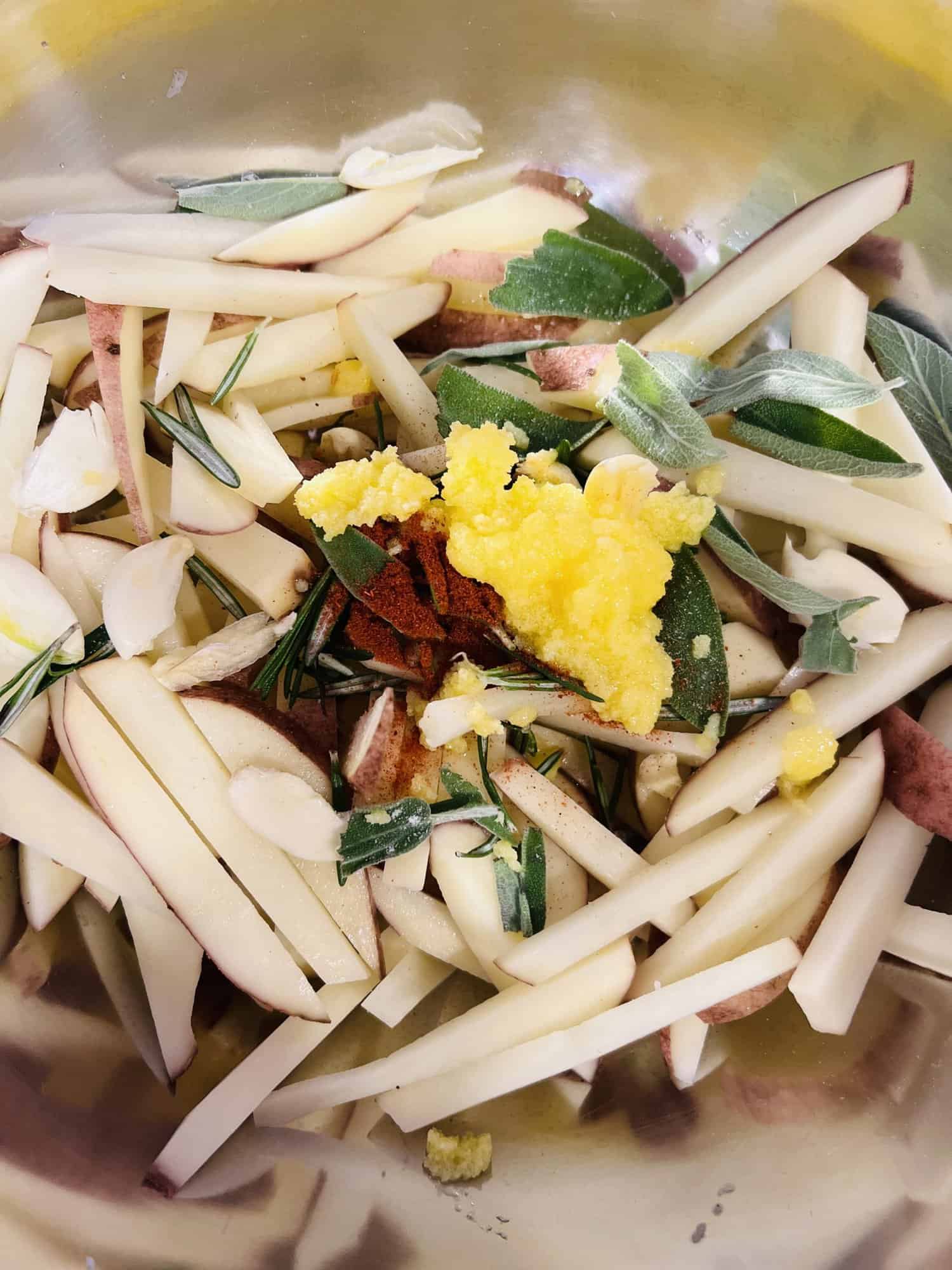 Coloca las papas en el mismo recipiente hondo ya seco y mézclalas muy bien con el aceite de oliva, la mantequilla, el romero, la salvia, los dientes de ajo machacados, la pimienta y una pizca generosa de sal.