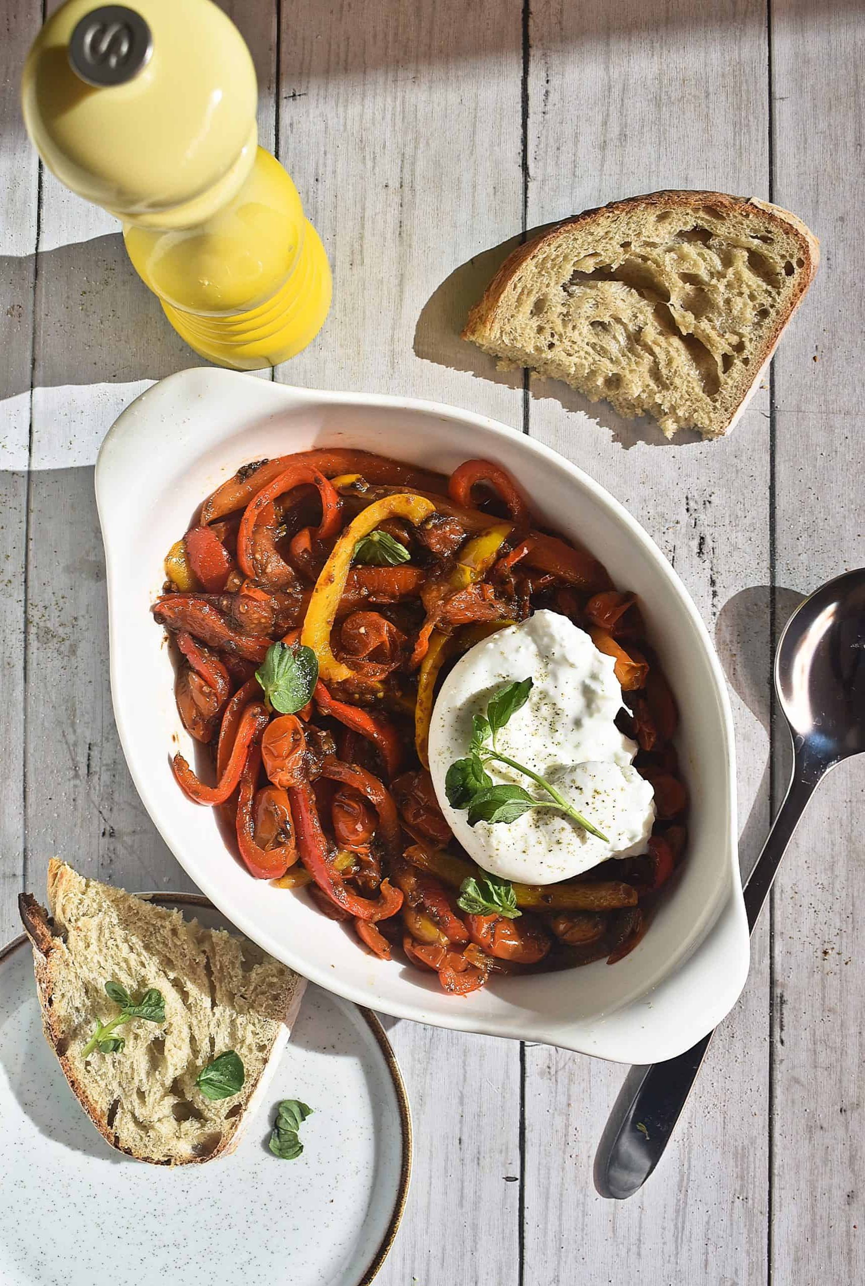 En esta receta, combinamos la suavidad de la burrata con pimentones en julianas, tomates cherry y hierbas aromáticas como tomillo y orégano. La preparación es sencilla y perfecta para una entrada, ensalada, un snack para compartir con amigas o familia o incluso para una cena rápida, perfecta para impresionar a familiares y amigos con un sabor auténtico italiano.