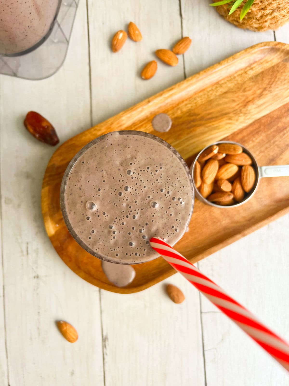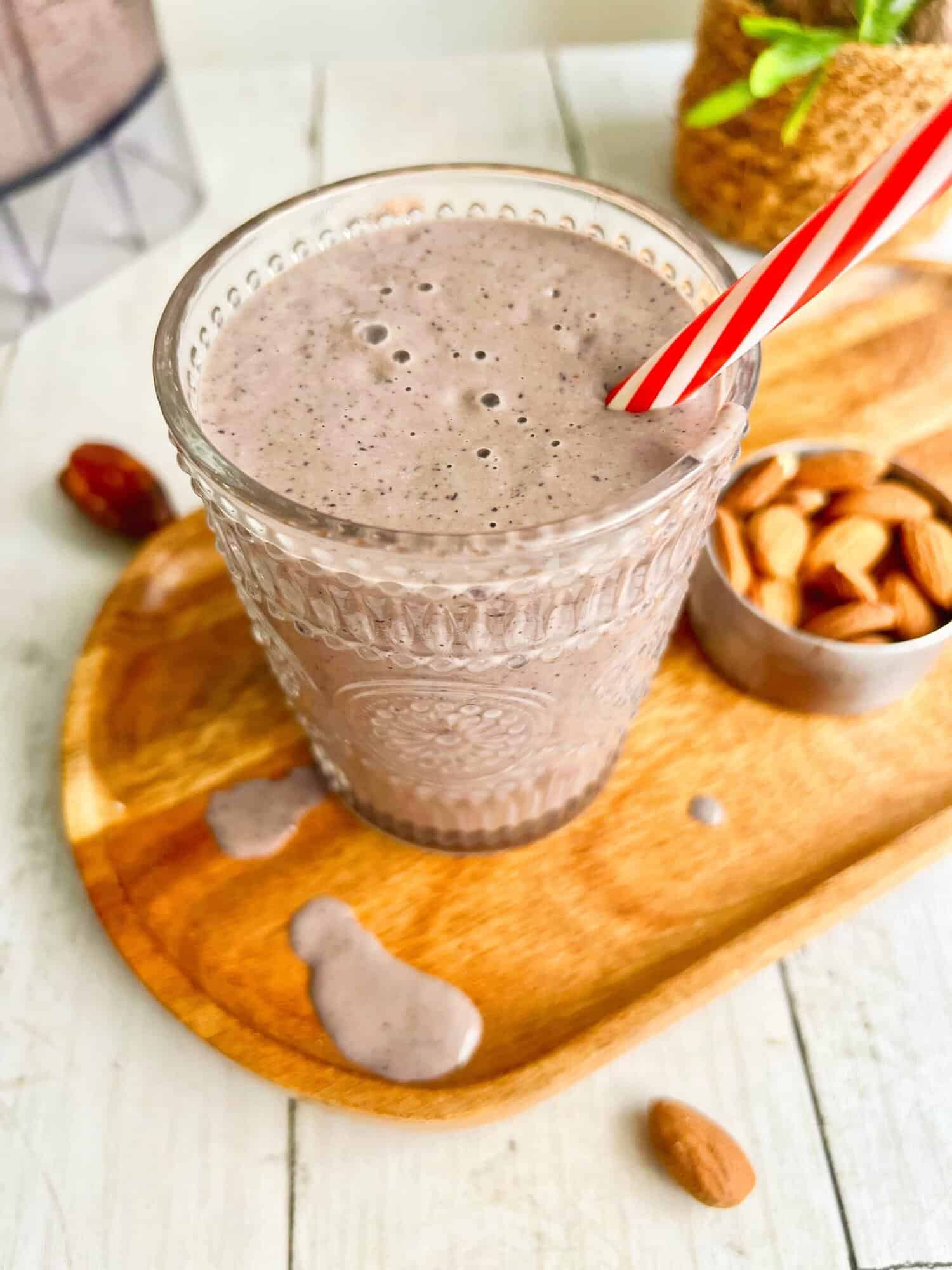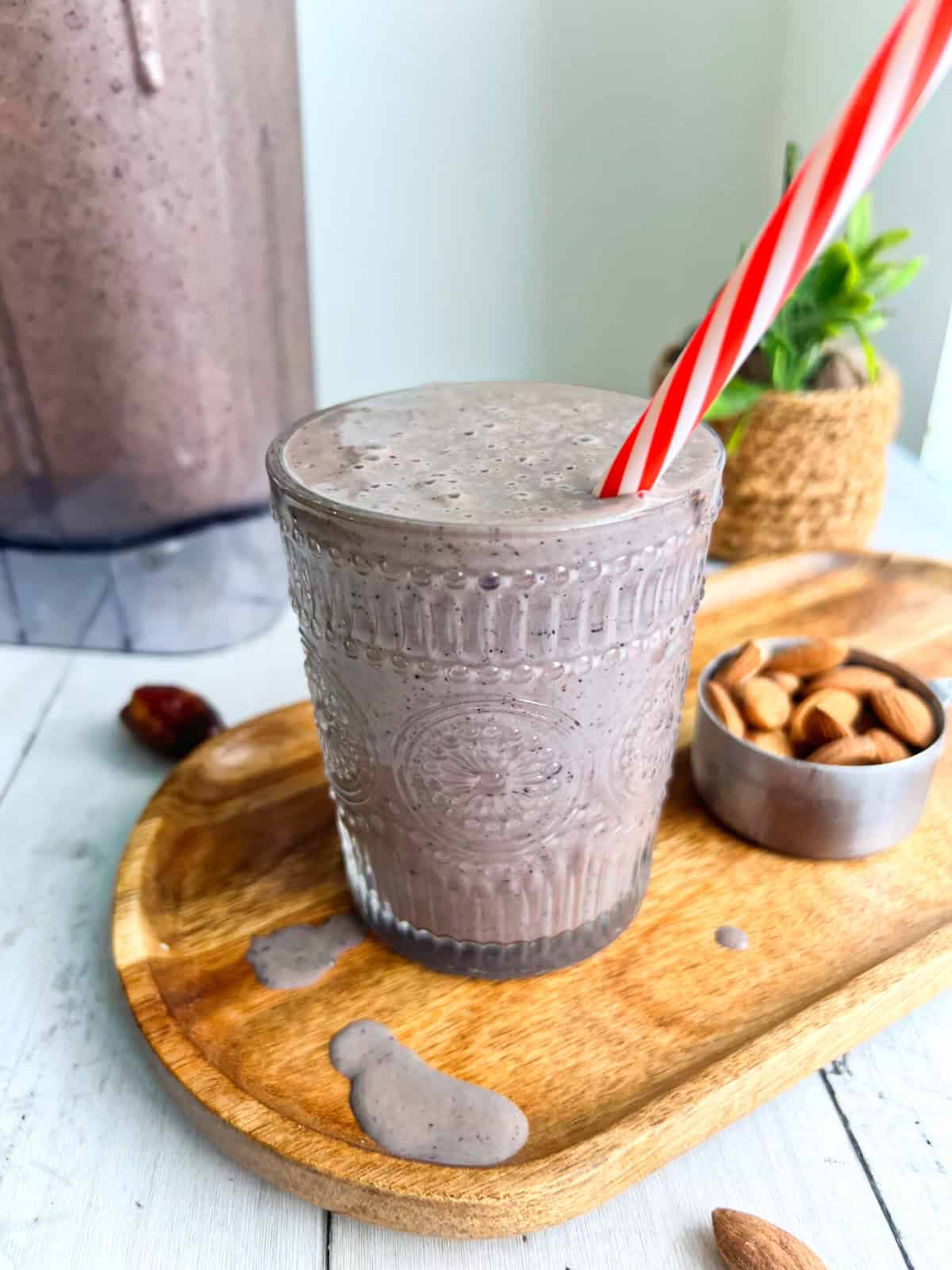 Agrega todo a la licuadora: El banano congelado, los arándanos, la mantequilla de almendras (o almendras enteras), la leche vegetal, la linaza molida, las semillas de chía y el dátil.