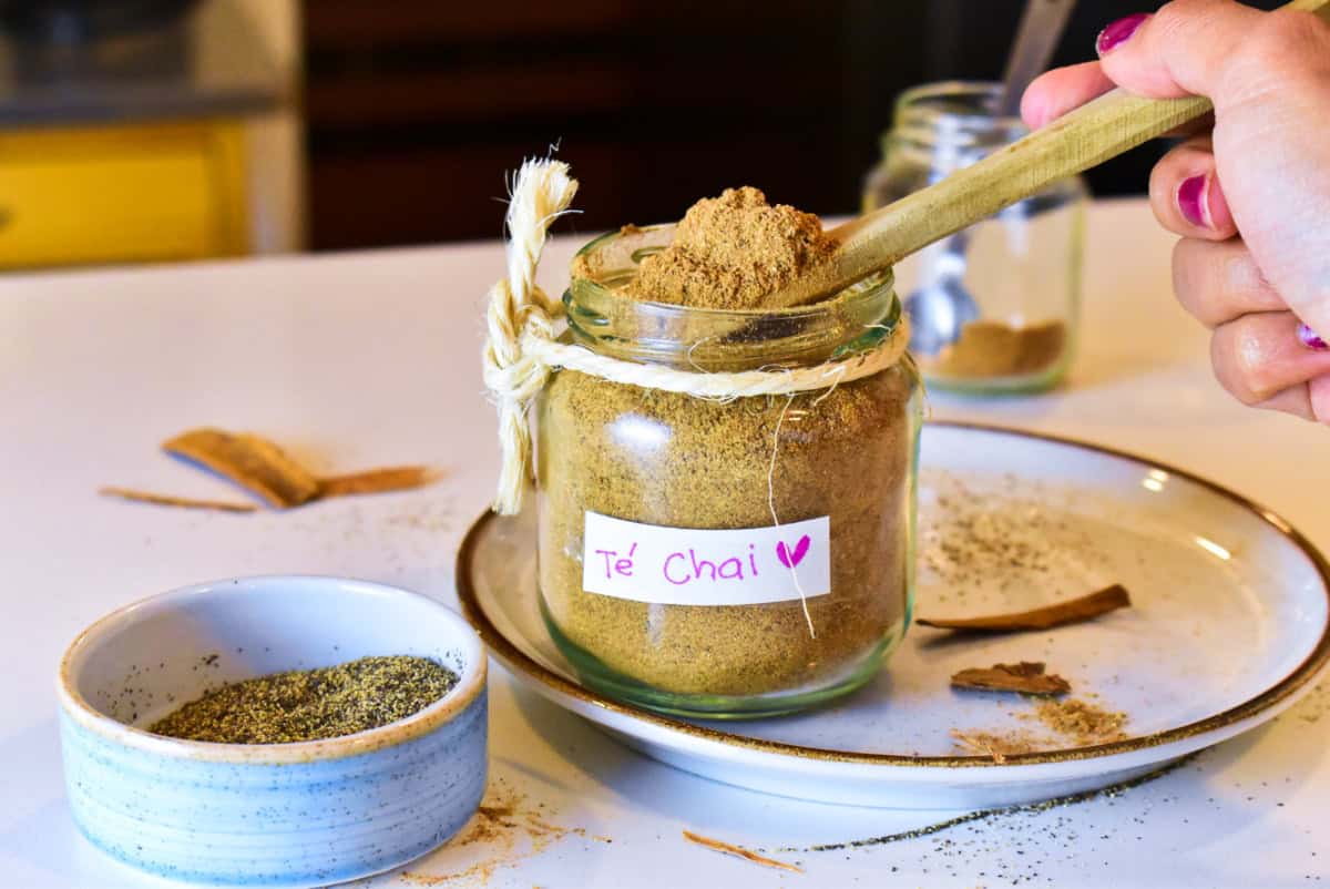 Agita o remueve bien para asegurarte de que todos los sabores se integren perfectamente. Esta mezcla se conserva a temperatura ambiente hasta por 3 meses, pero si prefieres, puedes guardarla en el refrigerador. Ahora, para disfrutar de un té chai sin cafeína caliente, añade 1.5 cucharadas de esta mezcla a una licuadora junto con 1 taza de leche vegetal caliente y 1 cucharada de miel de abeja pura. Licúa hasta combinar bien y sirve inmediatamente. Esta bebida no solo es una excelente alternativa al café, sino que también es el complemento perfecto para un buen postre. ¡Espero que lo disfrutes tanto como yo!