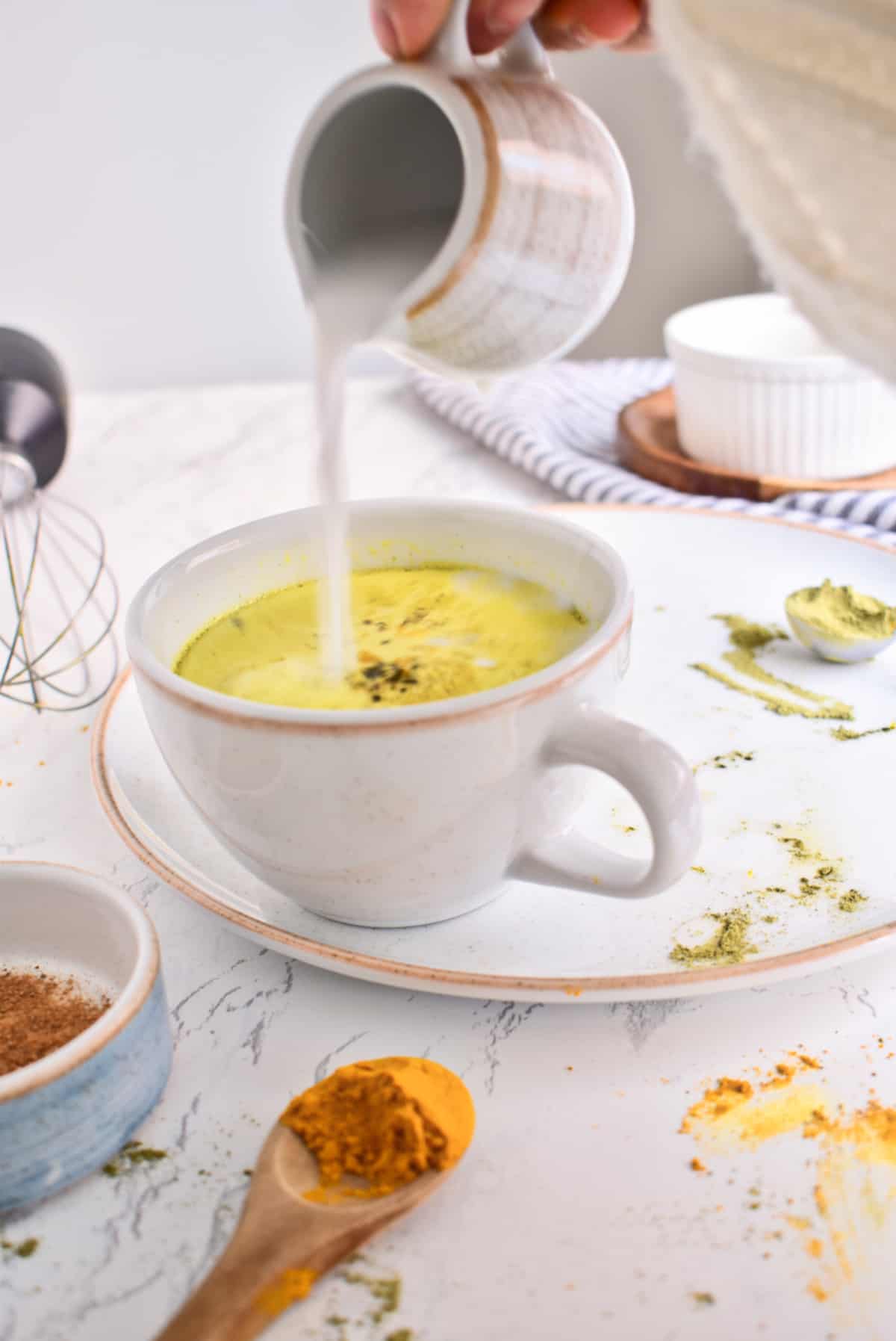 1. Añade todos los ingredientes excepto el polvo de matcha a una olla pequeña y calienta a fuego bajo. Mezcla frecuentemente, hasta que esté suave y caliente.