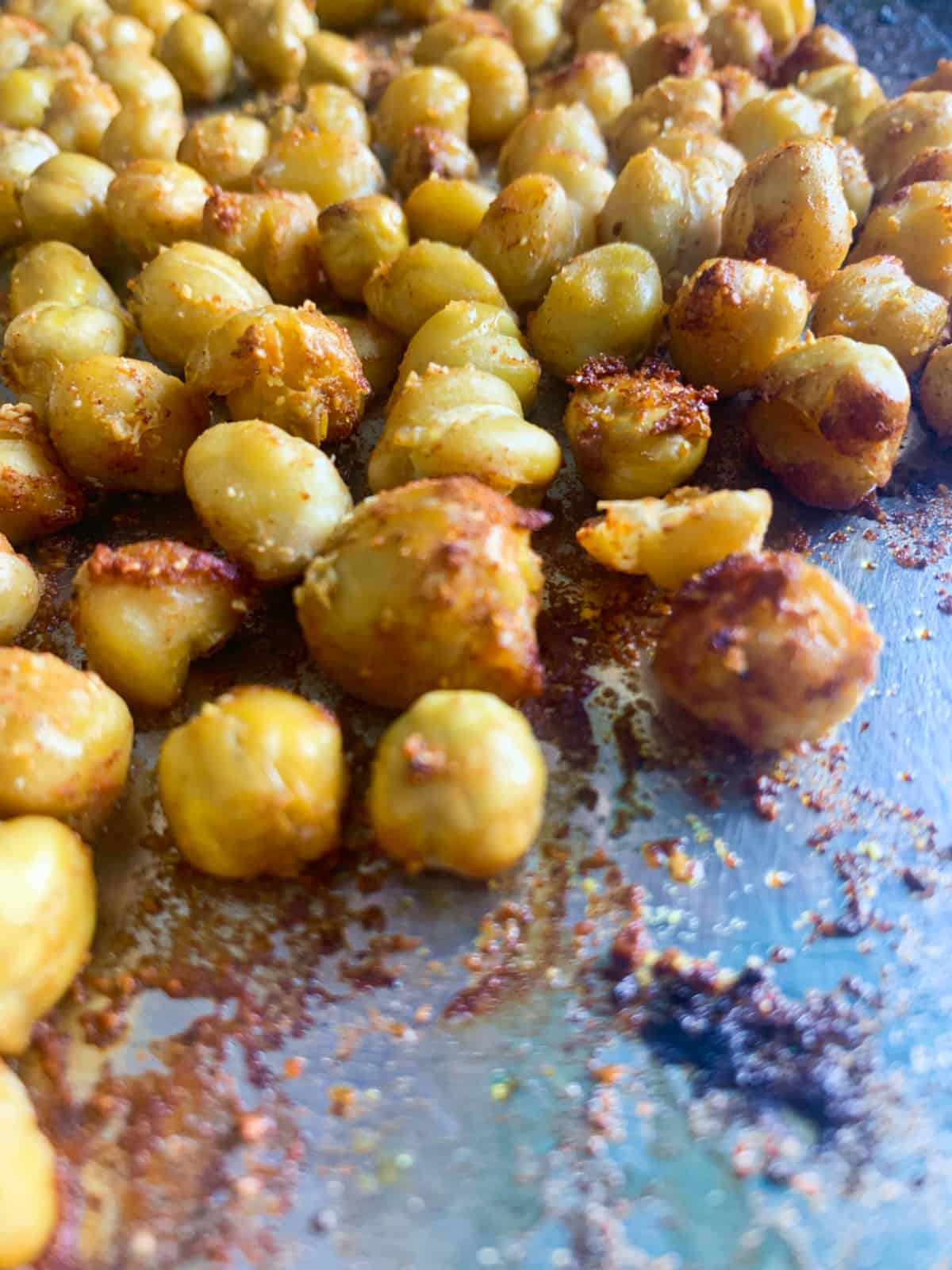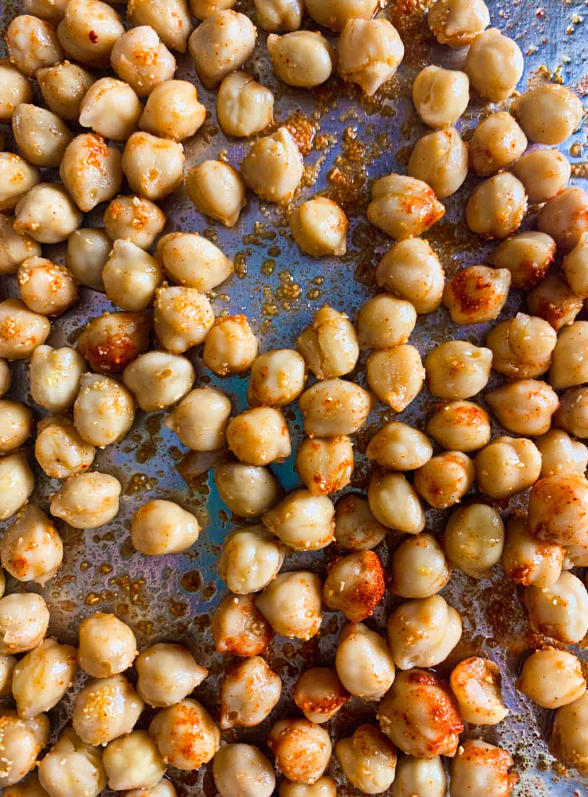 Pon los garbanzos en una bandeja junto con la paprika, ajo en polvo y el vinagre balsámico, mezcla muy bien hasta que los garbanzos queden completamente cubiertos.